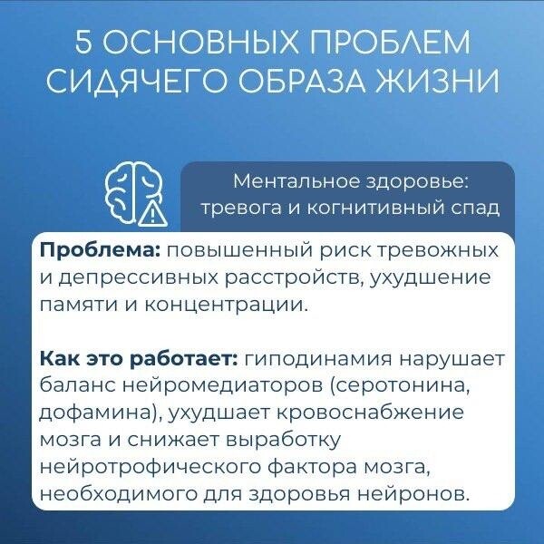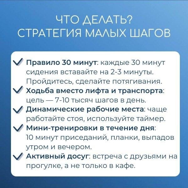 Читайте в карточках Центра общественного здоровья и медицинской профилактики ФМБА России 5 основных проблем сидячего образа жизни и стратегию малых шагов, как это исправить.