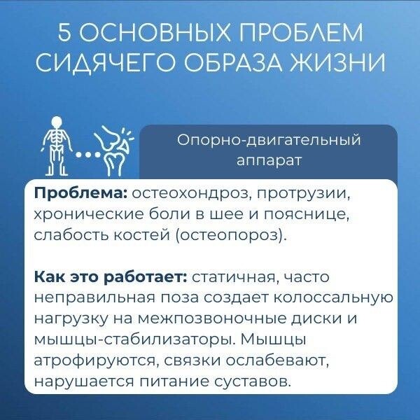 А ведь тело создано для движения, и когда его лишают этой возможности, начинаются системные сбои. И это не просто «немного испортится осанка», а прямая угроза внутренним системам организма.
