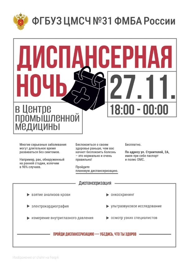27 ноября с 18:00 до 00:00 в Центре промышленной медицины вы сможете бесплатно проверить свое здоровье без отрыва от работы и личных дел.