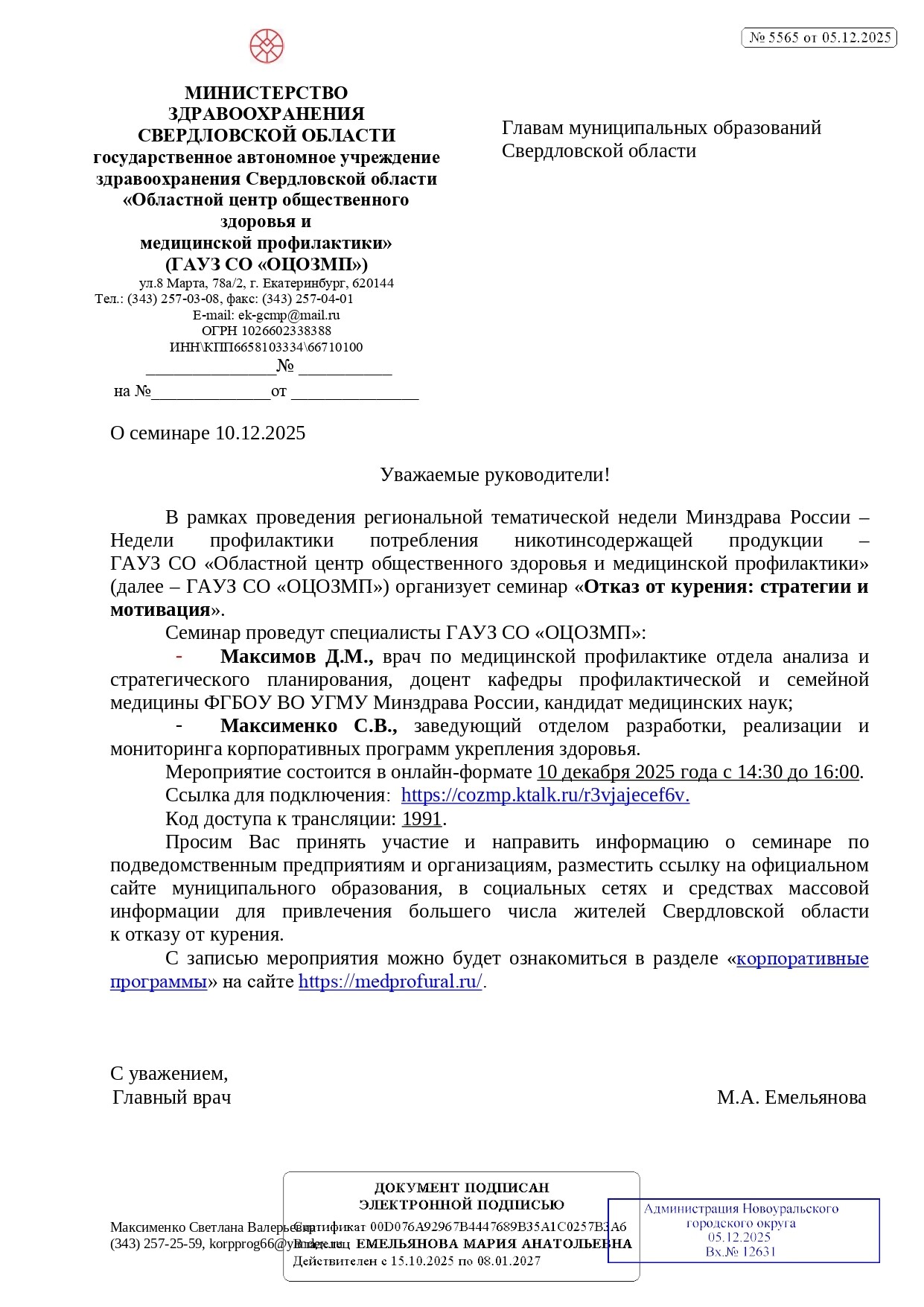 - Максимов Д.М., врач по медицинской профилактике отдела анализа и стратегического планирования, доцент кафедры профилактической и семейной медицины ФГБОУ ВО УГМУ Минздрава России, кандидат медицинских наук